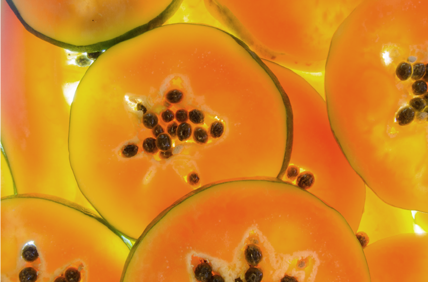 Papája - Papája pôsobí ako prírodné exfoliačné tonikum. Vďaka vysokému obsahu vitamínu A zanecháva pokožku bez škvŕn a rovnomerne tónovanú. Štúdie ukazujú, že enzýmy obsiahnuté v papáji majú pozitívny vplyv aj na zvrátenie procesu starnutia.