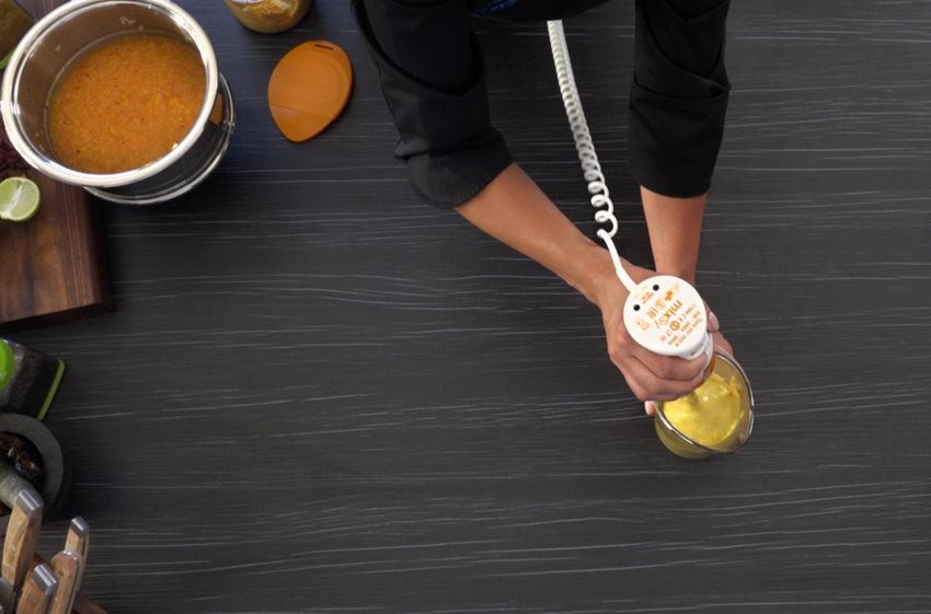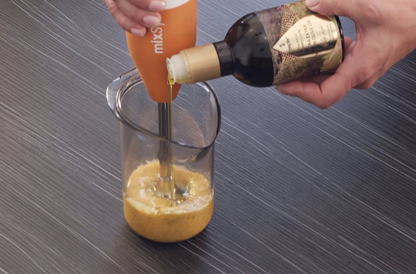 - Začnite mixovať mixérom MixSy so šľahacím nadstavcom a postupne pridávajte olivový olej.