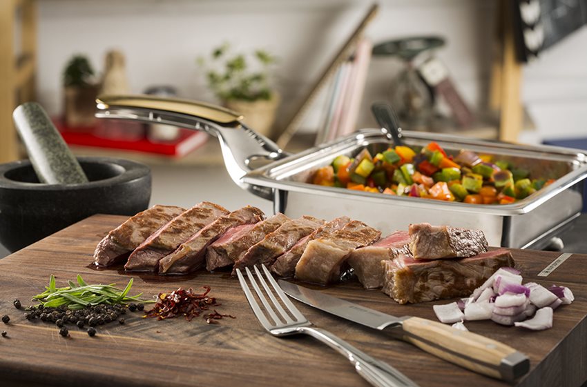 Pomocou kuchynského riadu Zepter Masterpiece sme k nášmu steaku pripravili aj krémovú zemiakovú kašu a grilovanú zeleninu. Toto úplne vyvážené jedlo je ľahko stráviteľné a plné živín, bielkovín, vitamínov a vlákniny. Použitie špičkovej nehrdzavejúcej ocele 316L, modernej technológie a inovatívneho dizajnu nádob Zepter Masterpiece Cookware umožňuje varenie bez vody a vyprážanie bez tukov. Jedlo je zdravšie a zároveň chutnejšie, zachováva si prirodzené vône, chute, výživové a biologické hodnoty a neprodukuje žiadne nebezpečné látky.