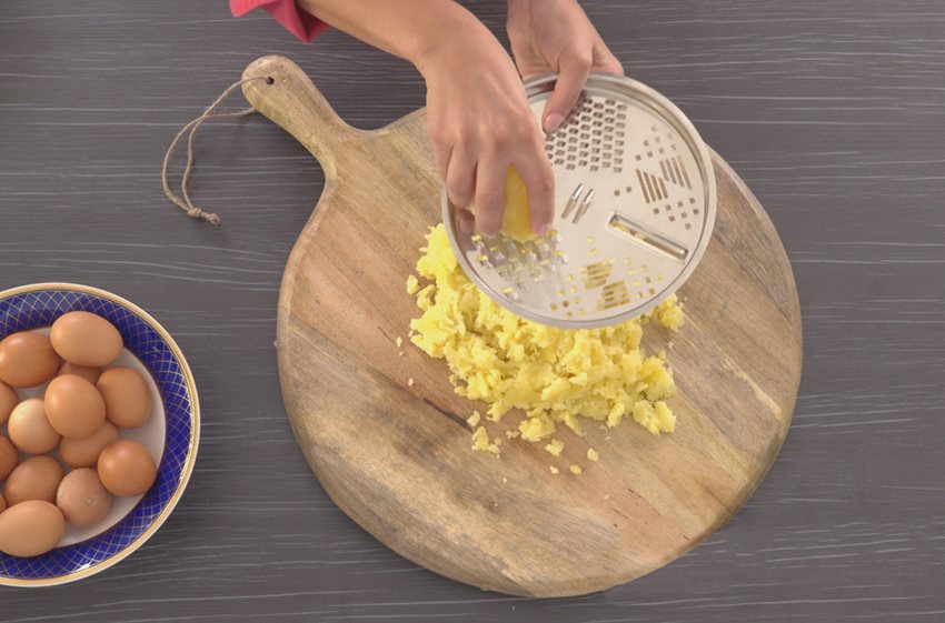 - Do zemiakov vmiešajte vajcia, parmezán a múku a hneťte, kým sa cesto nespojí.