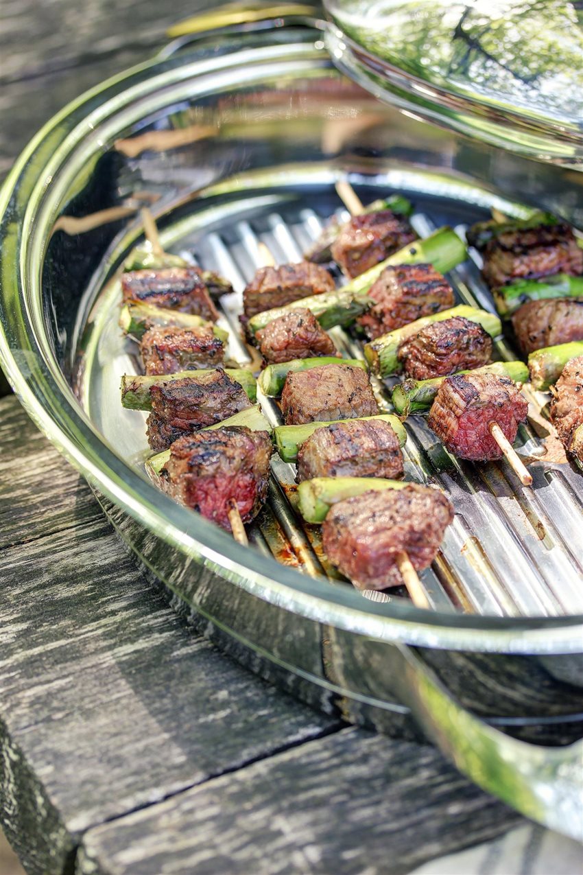 Príprava mäsa: všetky ingrediencie na marinádu vložte do vhodnej nádoby VacSy, dobre ich premiešajte a pridajte na kocky nakrájané mäso. Znovu premiešajte, nádobu VacSy uzavrite a nechajte cez noc v chladničke. Druhý deň (aj keď mäso môžete pripraviť pár dní vopred) mäso a špargľu striedavo napichujte na špajle a grilujte pár minút z každej strany dozlatista.