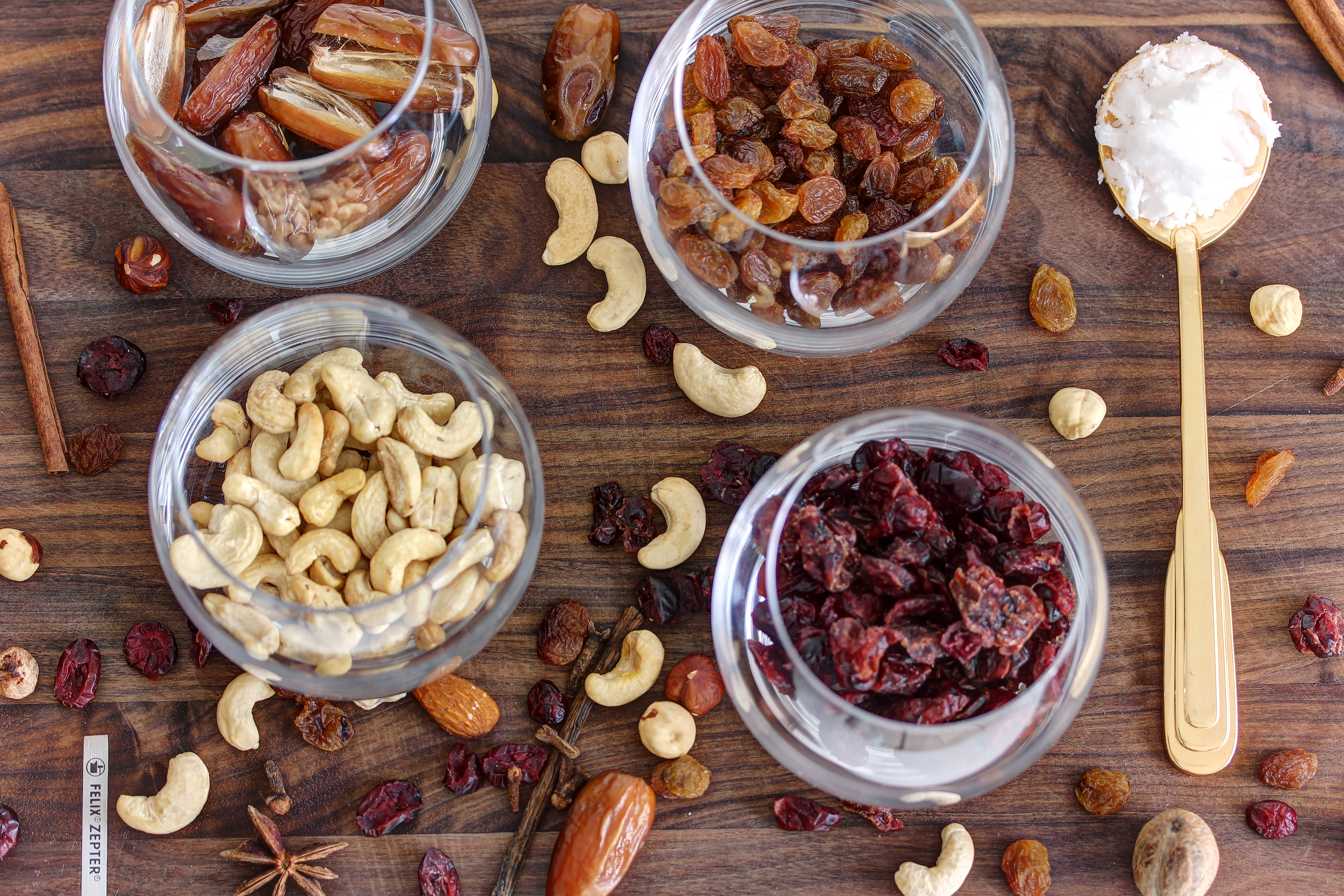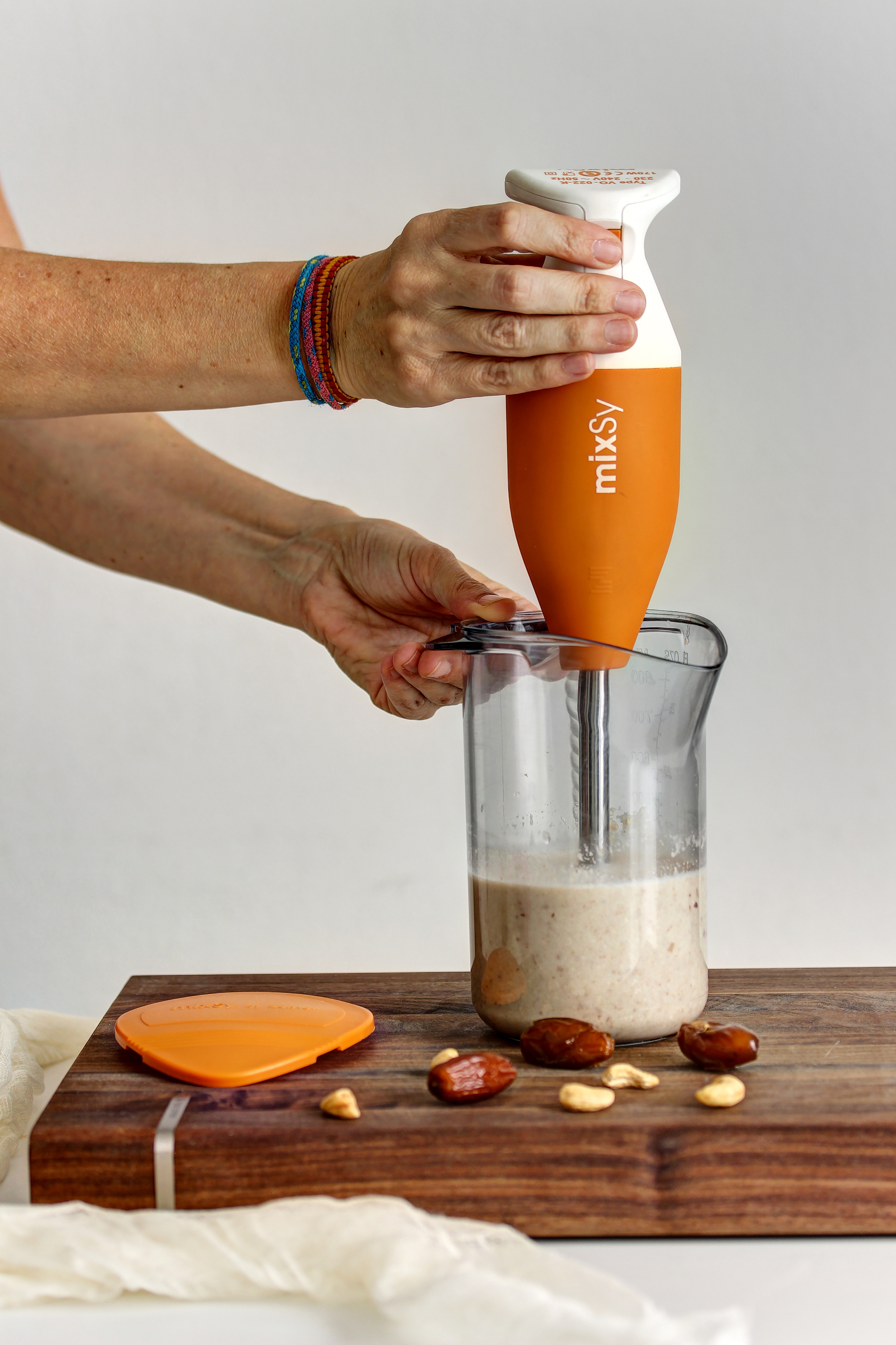• Pridajte kešu a ďatle do nádoby MixSy, zalejte vriacou vodou a nechajte odstáť cez noc.