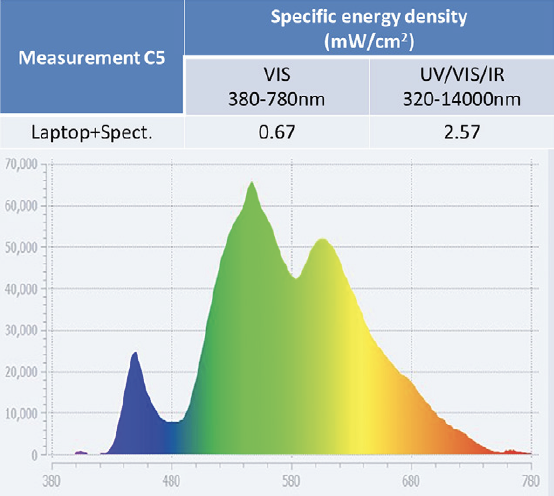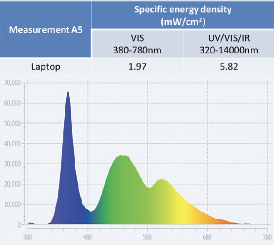 Viditeľná časť svetelného spektra LCD obrazovky notebooku zaznamenaná bez filtrov a rovnaké svetelné spektrum zaznamenané pomocou nanofotonických okuliarov. Významný rozdiel v znížení celkového spektra o 56 % a najviac v prípade modrého spektra, s relatívnym nárastom zeleného spektra.