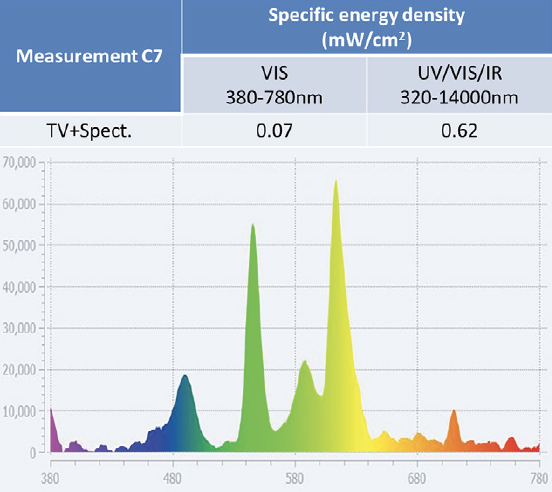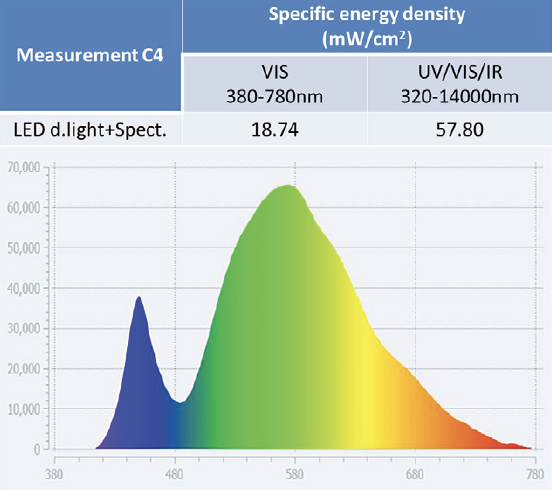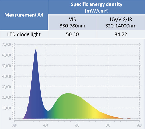 Viditeľná časť svetelného spektra LED zaznamenaná bez filtrov a rovnaké svetelné spektrum zaznamenané pomocou nanofotonických okuliarov. Významný rozdiel v znížení celkového spektra a najviac v prípade vysokoenergetického spektra, zatiaľ čo pomer modrého a zeleného spektra je pre ľudské oko oveľa priaznivejší.