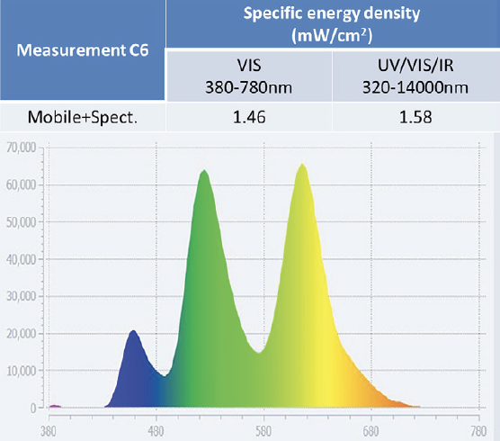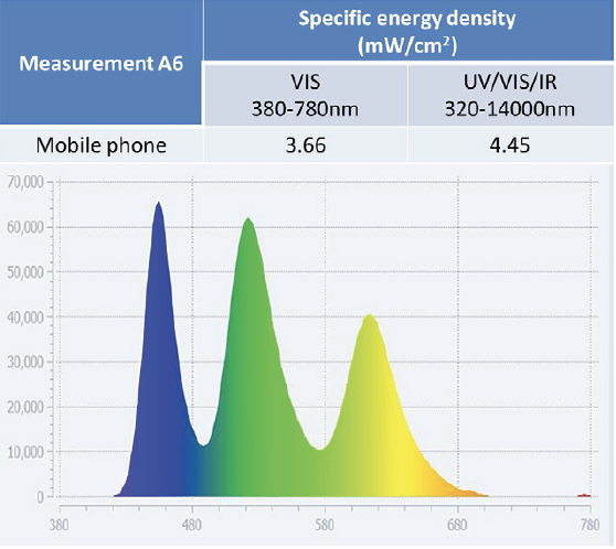 Viditeľná časť svetelného spektra obrazovky LED mobilného telefónu zaznamenaná bez filtrov a rovnaké svetelné spektrum zaznamenané pomocou nanofotonických okuliarov. Významný rozdiel v znížení celkového spektra o 65 % a modrého a zeleného spektra o 60 %.