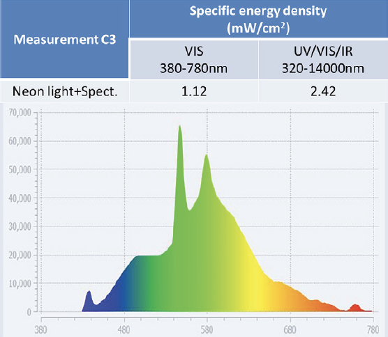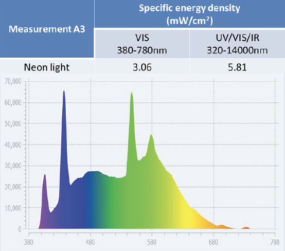 Viditeľná časť spektra neónového svetla zaznamenaná bez filtrov a rovnaké spektrum svetla zaznamenané pomocou nanofotonických okuliarov. Významný rozdiel v znížení celkového spektra o 58 % a predovšetkým o UV a vysokoenergetické modré spektrum.