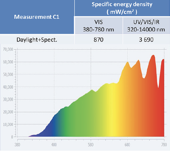 Viditeľná časť slnečného spektra zaznamenaná po 13 hodinách bez filtrov (vľavo) a rovnaké svetelné spektrum zaznamenané pomocou nanofotonických okuliarov (vpravo). Významný rozdiel v znížení celkového spektra (UV, viditeľné a infračervené) o 29 % a viditeľného spektra (najviac v prípade modrého a zeleného spektra).