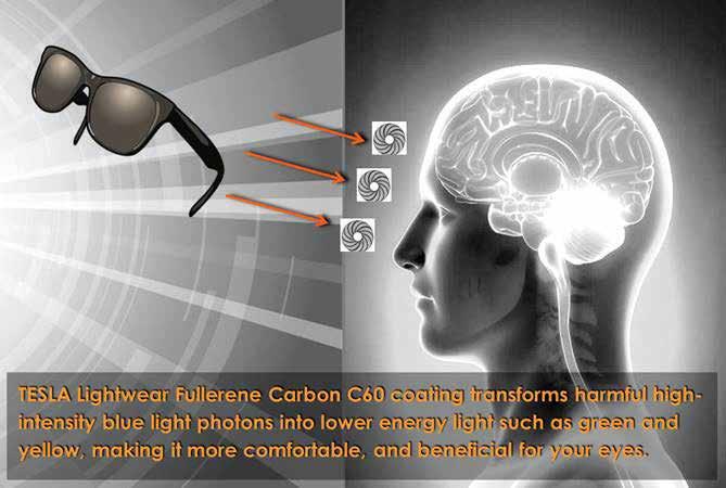 Prvou úlohou nanofotonických generátorov je generovať usporiadanie fotónov (zvislá orientácia elektromagnetického poľa každého fotónu) a druhou je generovať energiu fotónov na základe celkového momentu hybnosti v interakcii medzi svetlom a hmotou: keď svetelné fotóny vstupujú do kontaktu s fullerénom C60, dáva im nové usporiadanie a prerozdelenie energie. Fotóny rozptýleného svetla (slnečné svetlo, neónové a LED svetlo, svetlo prichádzajúce z obrazoviek televízie, mobilného telefónu alebo počítača), ktoré prechádzajú šošovkami okuliarov, menia svoj energetický vzorec z vysokoenergetického UV a modrého svetla, na nižšie energetické hladiny - zelené, žlté, červené svetlo. Z tvaru gule do tvaru toroidu). Vytvára sa tak svetlo novej kvality - hyperharmonizované svetlo (HHL). Zmena sférického tvaru na toroidný je založená na princípe čísla 3, Nikolu Teslu. To je dôvod, prečo boli nanofotonické okuliare pomenované po tomto geniálnom vedcovi (ktorý povedal: „Kto porozumie veľkoleposti čísla 3, bude mať kľúč k vesmíru.“).