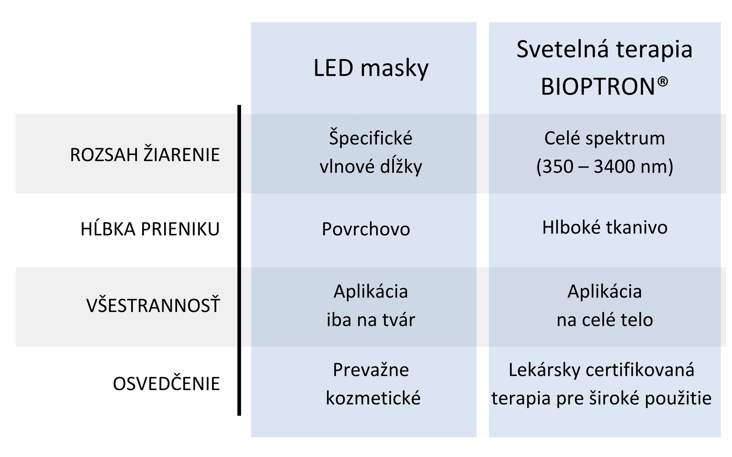 Svetelná terapia Bioptron ponúka oproti LED terapii výhody, vďaka ktorým je preferovanou voľbou ako pre lekárov, tak pre domácich užívateľov:Širšie spektrum pre rôzne zdravotné stavy: