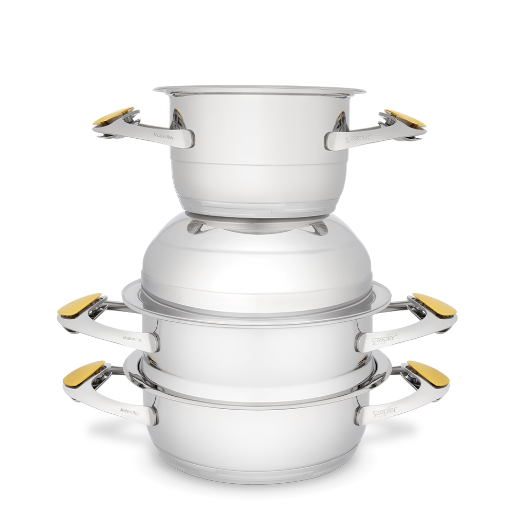 Zdravé varenie na nízkych teplotách: Dno každej nádoby Zepter Masterpiece je vyrobené z 3 vrstiev kovu (indukčnej, vodivej a akumulačnej). Špeciálnym prístrojom, pod tlakom 2000 ton, sa tieto tri vrstvy spoja s hlavnou časťou nádoby, čím sa zaručí pevnosť a znemožní sa oddeľovanie vrstiev. Akutermické kompaktné dno Zepter akumuluje energiu z rôznych typov sporákov, bez ohľadu na ich veľkosť. Teplo sa rýchlo a rovnomerne prenáša do stien nádoby a proces varenia prebieha aj po znížení intenzity ohrevu. Varenie na nízkych teplotách je ideálne, ak chceme v potravinách zachovať všetky pôvodné živiny a predísť ich zničeniu. Týmto spôsobom varenia šetríme až 70 % energie.