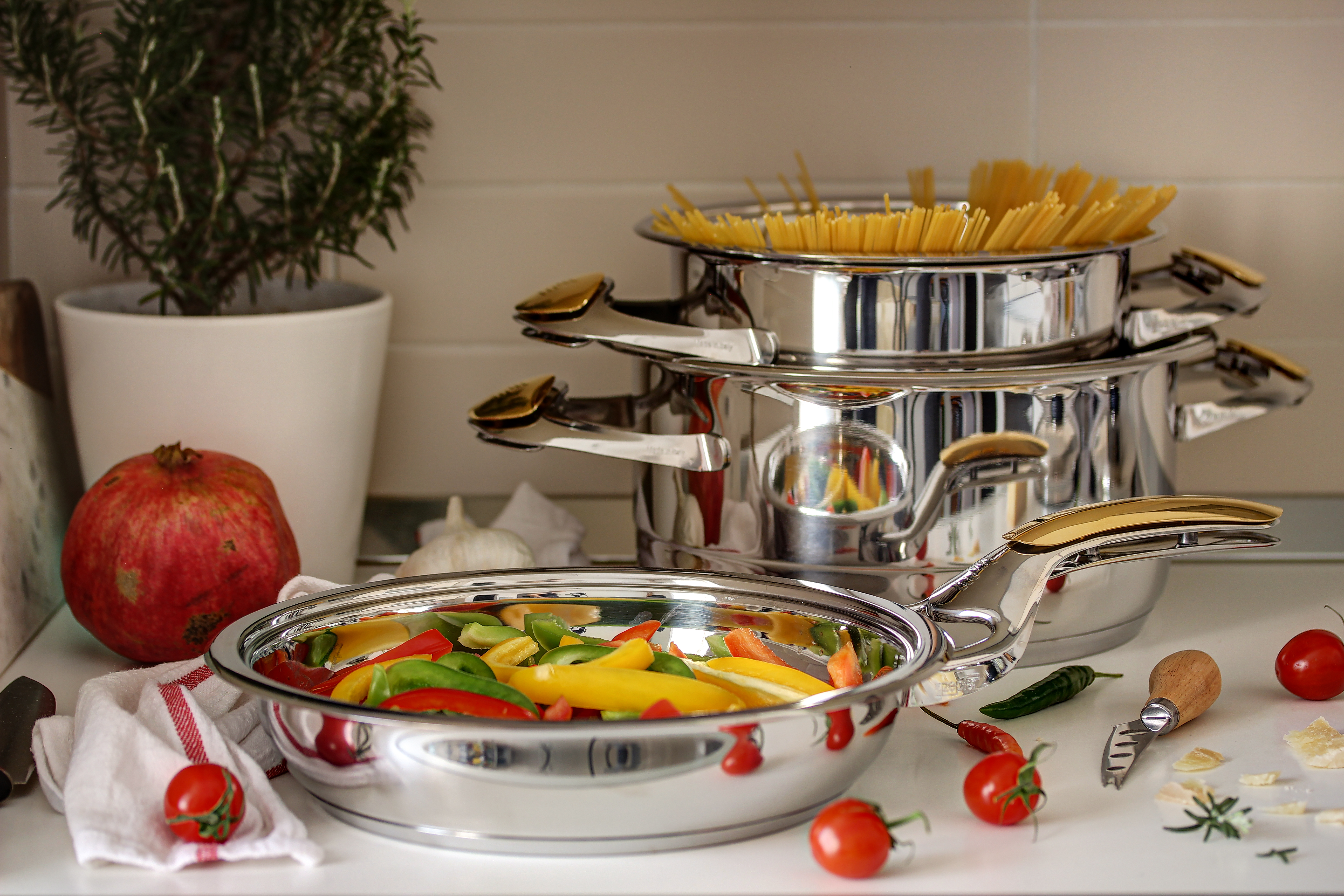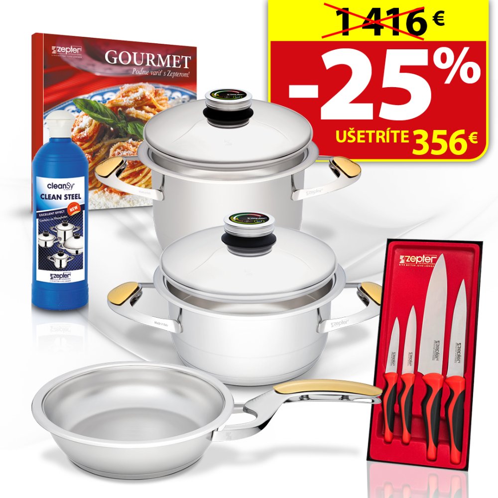 Špeciálny set sa skladá z nádoby s objemom 3 l a priemerom 20 cm, nádoby s objemom 4,2 l a priemerom 20 cm, panvice s objemom 1,6 l a priemerom 20 cm a 4 kuchynských nožov Zepter. S pomocou tohto vybavenia skrátite čas strávený v kuchyni, pozdvihnete svoje varenie na vyššiu úroveň a vďaka Zepter technológiám pripravíte pokrmy so zachovaním organoleptických vlastností a prospešných vitamínov aj minerálov. Ako darček dostanete k setu kuchárku Gourmet plnú inšpiratívnych a zdravých receptov a čistič na nádoby Zepter CleanSy.