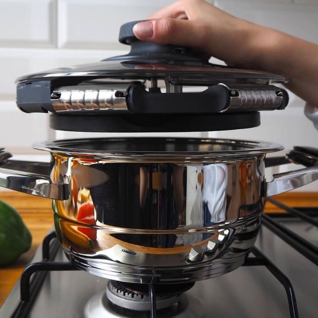 Pokrievka Syncro-Clik je opatrená uzamykacím mechanizmom, ktorý bráni zdvihnutiu pokrievky, kým sa nezníži vnútorný tlak v nádobe na bezpečnú úroveň. Vizuálny indikátor tlaku na termokontrole jasne ukazuje, kedy je nádoba pod tlakom. Na termokontrole môžete pozorovať aj pokles tlaku, keď nádobu odstránite zo zdroja tepla a nádoba sa začne ochladzovať. Ďalším bezpečnostným prvkom je uvoľňovací tesniaci otvor, ktorý uvoľní paru v prípade nadmerného nárastu tlaku, alebo v prípade upchatia hlavných tlakových ventilov.