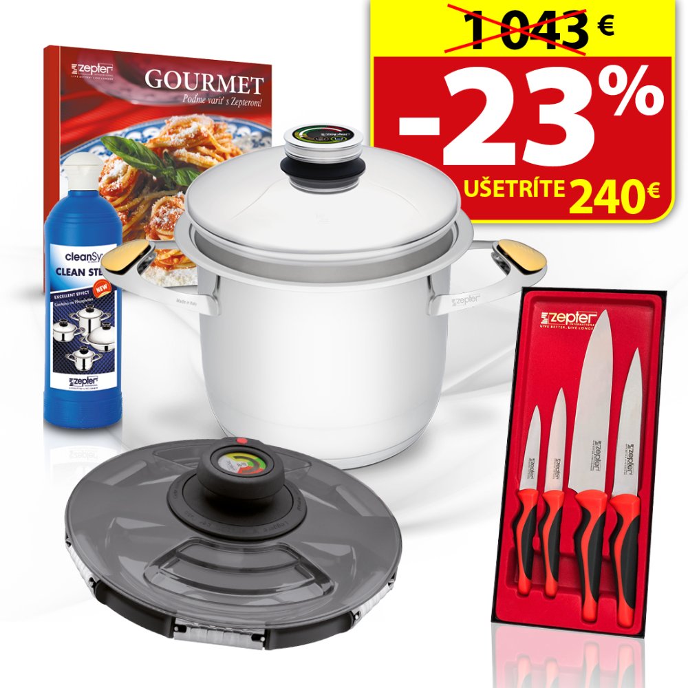 Špeciálny set sa skladá z nádoby s objemom 5 litrov, kompatibilnej tlakovej pokrievky Syncro-Clik s priemerom 20 cm a dvoch kuchynských nožov. S pomocou tohto vybavenia skrátite čas strávený v kuchyni, pozdvihnete svoje varenie na vyššiu úroveň a vďaka Zepter technológiám pripravíte pokrmy so zachovaním organoleptických vlastností a prospešných vitamínov i minerálov. Ako darček dostanete k setu kuchárku Gourmet plnú inšpiratívnych a zdravých receptov a čistič na nádoby Zepter CleanSy.