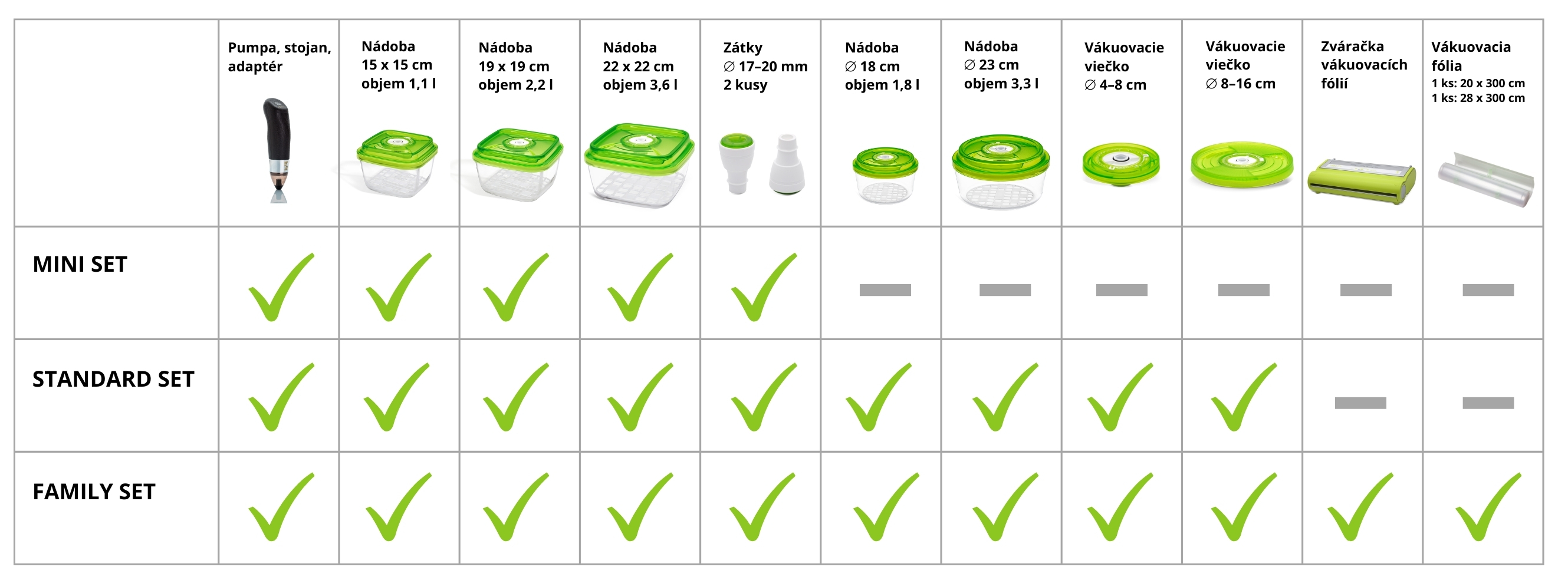 SK-VacSy-sety.jpgSklenenú okrúhlu nádobu s objemom 1,5 litra si môžete zaobstarať samostatne, alebo ako súčasť VacSy setov, ktoré obsahujú vákuovaciu pumpu Deluxe, hranaté vákuovacie nádoby, vákuovacie zátky na fľaše, univerzálne vákuovacie viečka alebo zváračku vákuovacích fólií ––⁠ VacSy Standard set, VacSy Family set.