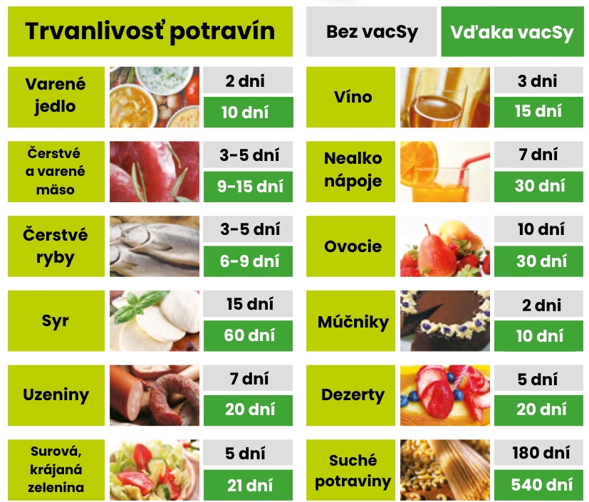 Pri klasickom skladovaní podliehajú potraviny oxidácii, kvaseniu a pôsobeniu vlhkosti, teploty, vzduchu i biologických vplyvov, ako sú baktérie, huby, aeróbne organizmy, vírusy či parazity. Vo VacSy nádobách zostáva jedlo 3–5x dlhšie čerstvé, neosychá a je chránené pred pôsobením škodlivých organizmov, ktoré sa vo vákuu nemôžu šíriť ani množiť. Vo vákuu sa neprenášajú ani pachy, vďaka čomu si vždy pochutnáte na potravinách, ktoré skladovaním nestrácajú kvalitu ani chuť.