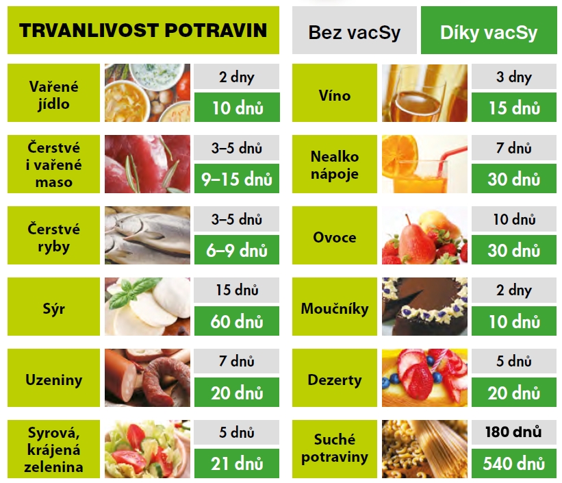 Pri klasickom skladovaní podliehajú potraviny oxidácii, kvaseniu a pôsobeniu vlhkosti, teploty, vzduchu i biologických vplyvov, ako sú baktérie, huby, aeróbne organizmy, vírusy či parazity. Vďaka systému VacSy zostáva jedlo 3–5x dlhšie čerstvé, neosychá a je chránené pred pôsobením škodlivých organizmov, ktoré sa vo vákuu nemôžu šíriť ani množiť.