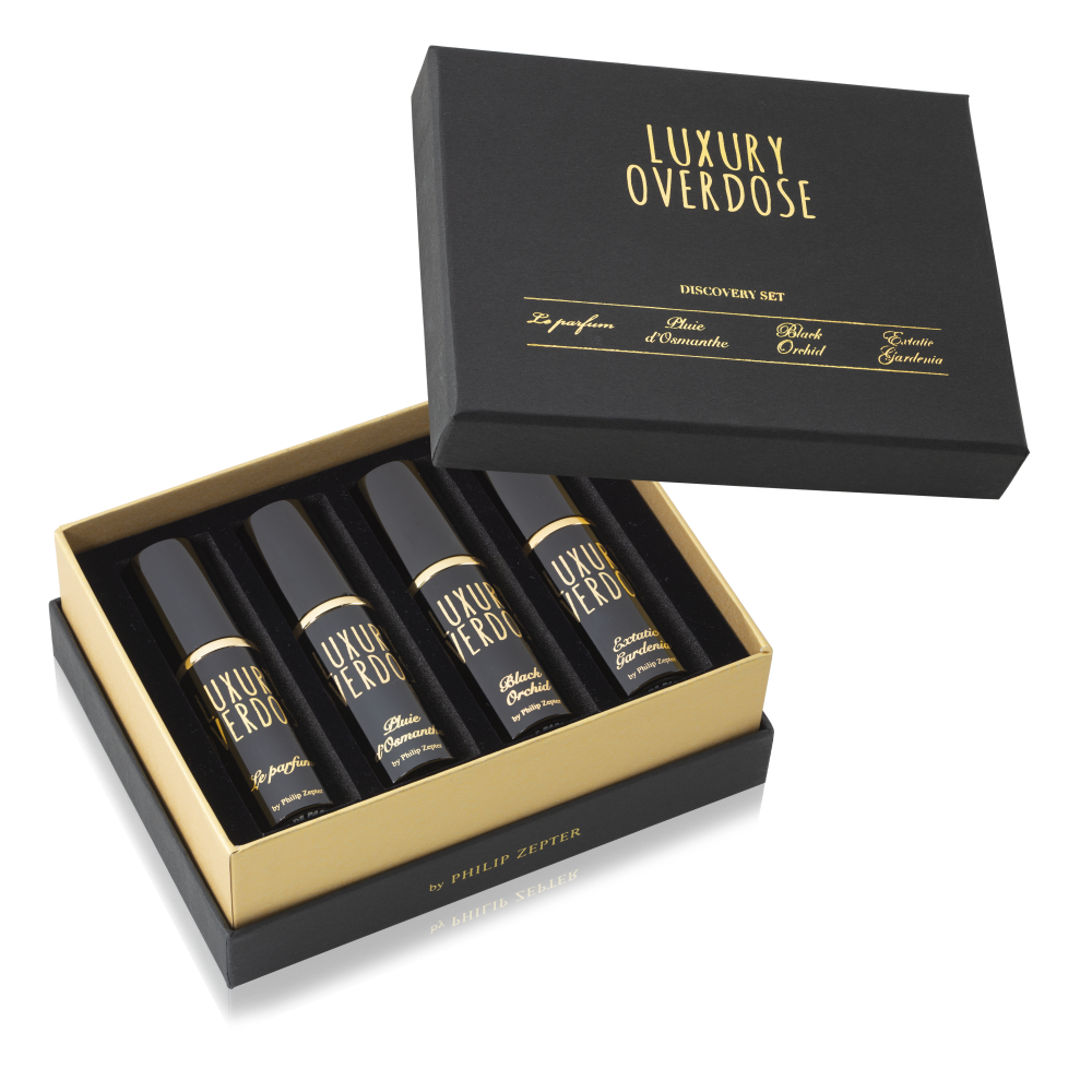 Luxusný a ľahko prenosný set Luxury Overdose Discovery Set pozostáva z 4 x 10 ml znovu naplniteľného flakónu s rozprašovačom s kovovým puzdrom, ktorý obsahuje štyri z najkrajších vôní kolekcie Luxury Overdose.